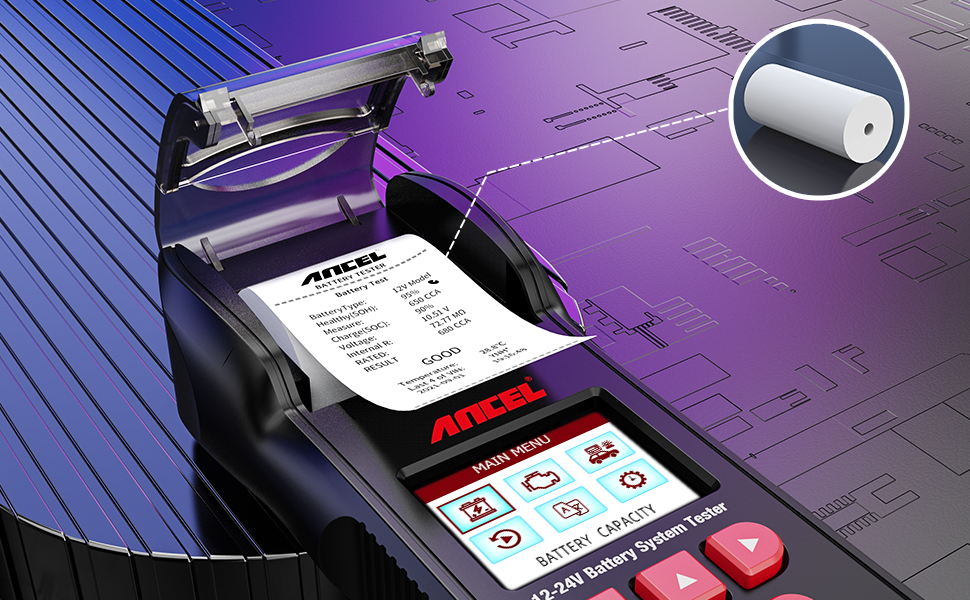 El probador de batería ANCEL BST600 está diseñado pensando en la comodidad y la funcionalidad amplia. Además de la función de impresora, cuenta con una amplia capacidad para el diagnóstico y mantenimiento de la batería. Funciona en sistemas de batería de 12V y 24V, incluida la prueba de amperios de arranque en frío reales, la prueba de estado de salud y el diagnóstico de sistemas de arranque y carga para fallas comunes. También tiene una impresora integrada capaz de imprimir resultados de prueba para un servicio mejorado. Esta herramienta le permite conocer el estado del sistema de batería por adelantado, ahorra un viaje y dinero a un taller de reparación de automóviles.